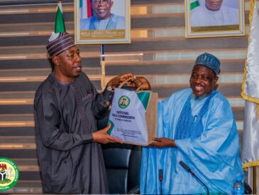 *Photo R-L: NAHCON Chairman/CEO, Professor Abdullahi Saleh Usman presenting a souvenir to Governor Babagana Zulum …